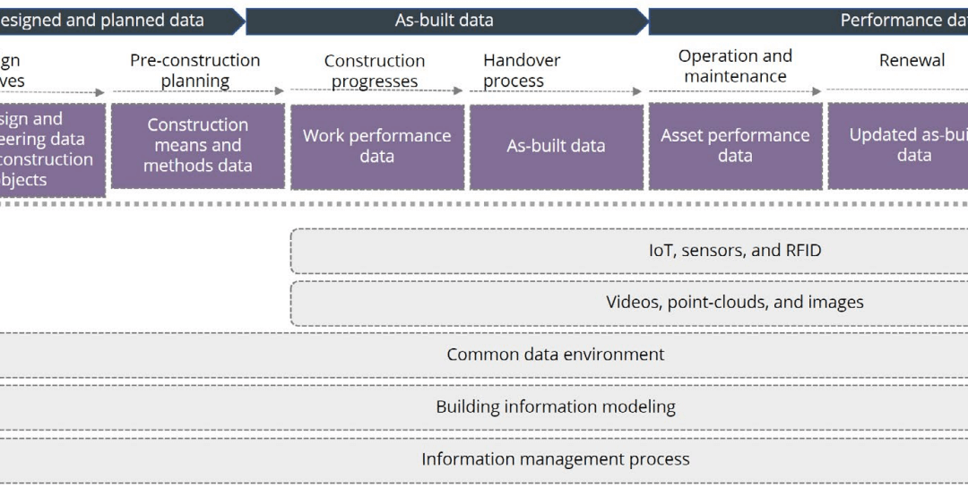 Diagram showing data, information and information management activities across the asset lifecycle in relation to digital twins